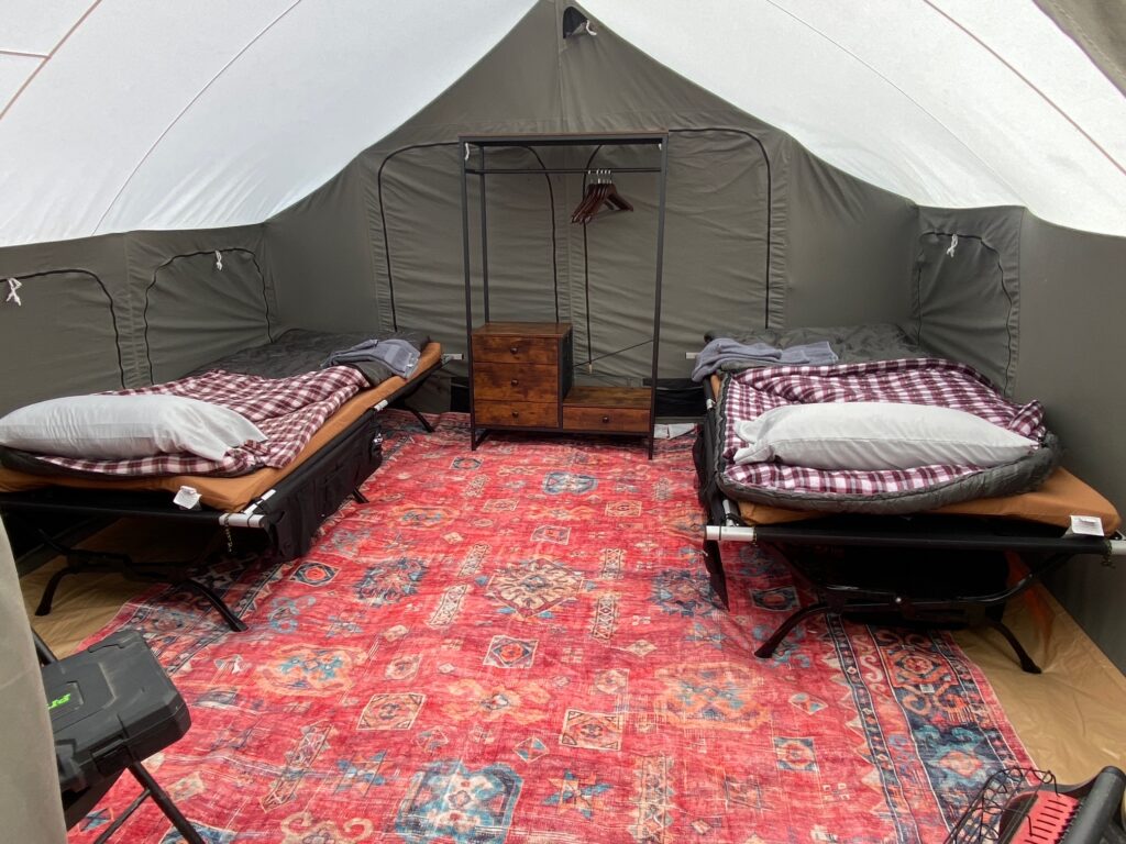 - Comfortable cots and sleeping pads